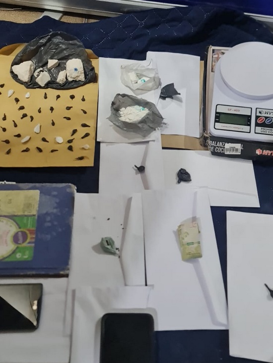 Además, la Policía secuestró envoltorios de cocaína y marihuana, más de 200 mil pesos argentinos, una balanza digital de precisión, ocho aves silvestres y elementos probatorios para la causa. La sustancia incautada podrís fraccionarse en 614 dosis y estarían valuadas, en la venta al menudeo, en cerca de $1.700.000.