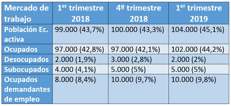 Comparando los números de 2019 con los del cuarto trimestre de 2018 surge también un aumento de 5.000 puestos de trabajo, o sea el 2,1%. La desocupación era de 3.000 trabajadores evidenciando una disminución de 1.000 asalariados (0,8%).