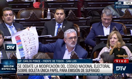 Por el lado de Carlos Ponce, el diputado oficialista, alegando que muchos de los ciudadanos se preguntan cómo va a ser la boleta, comenzó su alocución mostrando una enorme lámina a modo de ejemplo de cómo sería la BUP para un lugar como Buenos Aires.
