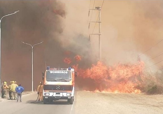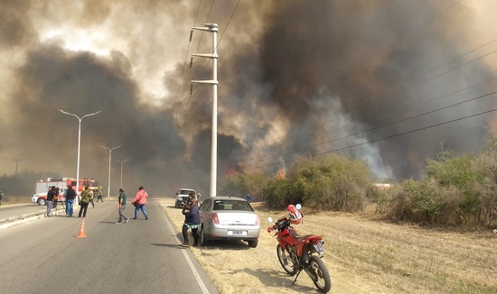 [dropcap style=”circle”]D[/dropcap]e acuerdo a un comunicado emitido por Bomberos Voluntarios de Merlo, la situación actual del incendio forestal en la zona turística es crítica, por lo que se solicita a la comunidad no circular por ruta N° 5, ya que las llamas han cruzado a ambos lados de la ruta, mientras que maquinaria municipal se encuentra trabajando en la parte sur.