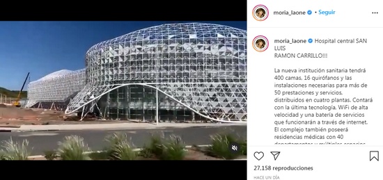 [dropcap style=”circle”]E[/dropcap]l día de ayer, Moria Casán sorprendió a propios y extraños con una publicación en su cuenta oficial de Instagram, promocionando la obra del Hospital Central Ramón Carrillo. La publicación de Moria no es más que una copia textual de la descripción oficial de la obra, copiada de un artículo de la Agencia de Noticias del Gobierno.