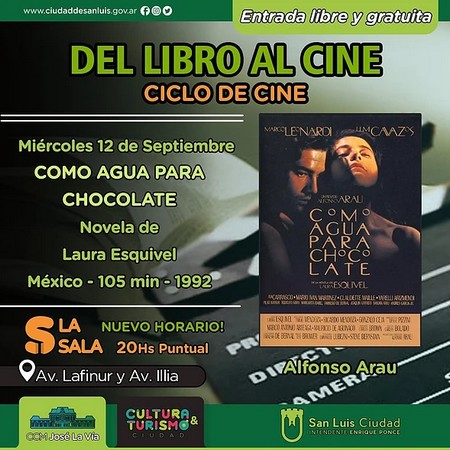 En el marco del ciclo “Del libro al cine”, esta semana se proyectará “Como agua para chocolate”, una película del año 1992 dirigida por Alfonso Arau, basada en la novela homónima de la escritora mexicana Laura Esquivel. La función es hoy miércoles, a las 20 horas, Te esperamos este miércoles 12 de septiembre, a las 20 horas, en el Centro Cultural Municipal José La Vía. Entrada libre y gratuita.