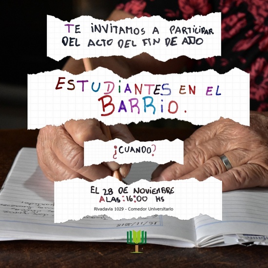 [dropcap style=”square”]L[/dropcap]os jóvenes que forman parte del programa de alfabetización Estudiantes en el Barrio realizarán un acto de cierre del año en el Comedor Universitario (Rivadavia 1029, entre Bolívar y Lavalle) el miércoles 26 a las 16 horas.