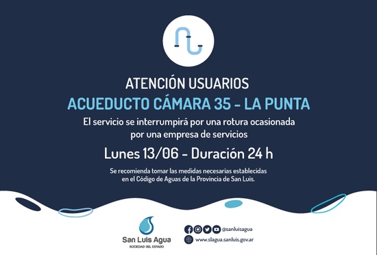 El equipo de San Luis Agua ya se encuentra trabajando en el lugar, pero el abastecimiento a dicha localidad se verá afectado por un lapso de 24 horas, por lo que recomendamos a todos los usuarios extremar el uso del recurso y tomar las medidas necesarias, que se encuentran establecidas en el Código de Aguas de la Provincia de San Luis.
