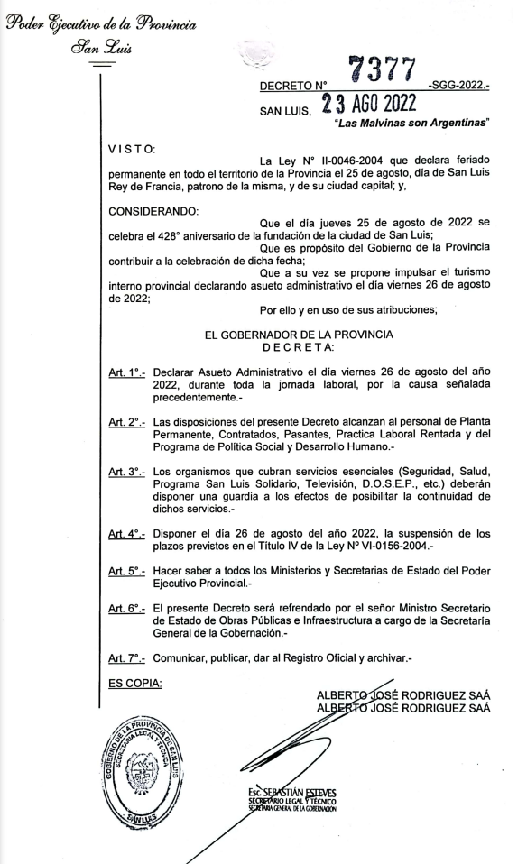 [dropcap style=”circle”]E[/dropcap]l gobernador Alberto Rodríguez Saá decretó asueto administrativo durante toda la jornada del viernes 26 de agosto en el marco de la conmemoración del 428 aniversario de la fundación de la ciudad de San Luis. Por lo tanto, los empleados públicos provinciales tendrán un fin de semana largo de cuatro días.