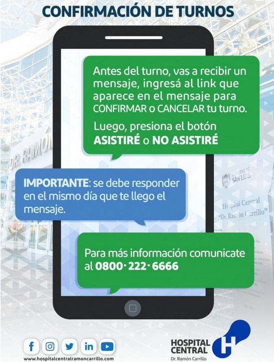 [dropcap style=”circle”]A[/dropcap] través de un comunicado de prensa emitido el día de hoy, desde el hospital Ramón Carrillo recomiendan confirmar los turnos dentro de las 24 horas de la notificación, respondiendo el mensaje de texto que reciben como notificación. “Aconsejamos que la persona brinde un número de teléfono válido y que revise ese dispositivo”, sugirió Cynthia Alderete, jefa operativa del Centro de Comando.