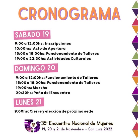 Las publicaciones dadas a conocer los últimos días, a través de las redes oficiales del Encuentro, detallan los talleres, los horarios de actividades como la apertura y la marcha (que será el domingo a las 19 horas), y también realizan una convocatoria para puestos de comida.