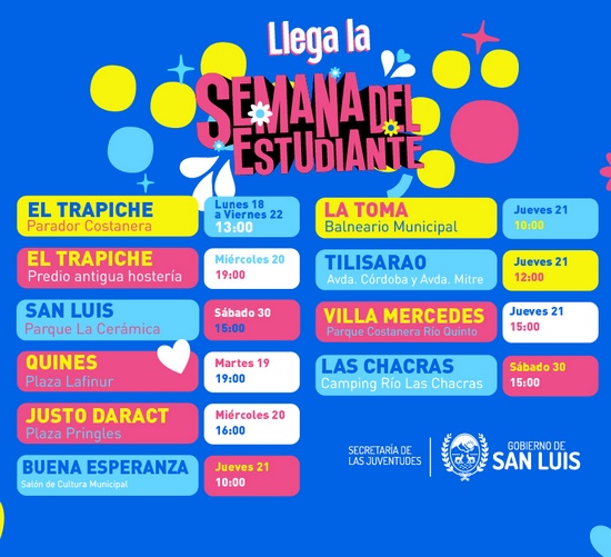 En El Trapiche las actividades se concentrarán del 18 al 22 de septiembre. Mientras que, en el resto de la provincia, los festejos serán el 19 en Quines (Plaza Lafinur); el 20 en Justo Daract (Plaza Pringles), el 21 en Villa Mercedes (Parque Costanera del Río V), Tilisarao (Av. Córdoba y Mitre, frente a la Municipalidad), La Toma (Balneario y Camping Municipal) y Buena Esperanza (Salón de la Cultura Municipal); y el cierre es el 30 en San Luis (Parque “La Cerámica”) y en Las Chacras (Balneario municipal “Las Chacras”).