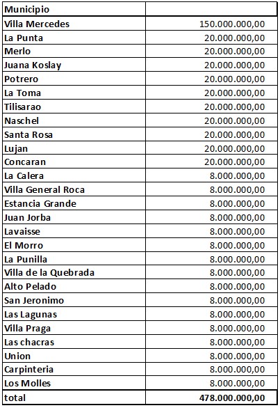 En total, serán 478 millones que serán reasignados para incluir a los siguientes 27 municipios. Como puede apreciarse en la imagen, la mayor partida es para Villa Mercedes, lo cual no es llamativo ya que es el que tiene la mayor cantidad de población y además es un municipio oficialista. En cuanto a municipios opositores, el listado incluye a La Punta, Santa Rosa del Conlara y Unión; pero deja afuera a Anchorena, Bagual, Fortuna, Villa del Carmen y, principalmente, a la ciudad de San Luis.