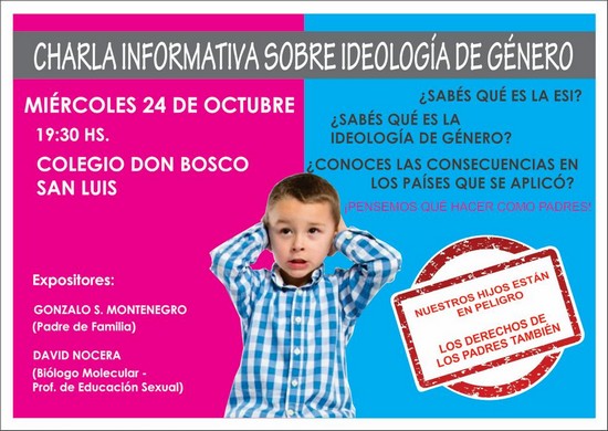 [dropcap style=”square”]E[/dropcap]l viernes 19 de octubre, el gobernador, Alberto Rodríguez Saá, firmó el decreto para que la provincia adhiriera a la ley nacional 26.150 de “Programa Nacional de Educación Sexual Integral”. Pocos días después, las charlas y marchas bajo el lema #ConMisHijosNoTeMetas, impulsadas por grupos de padres que en particular están preocupados por la “ideología de género” que transmite esta ley aprobada hace 10 años, comenzaron a gestarse en escuelas religiosas de la provincia.