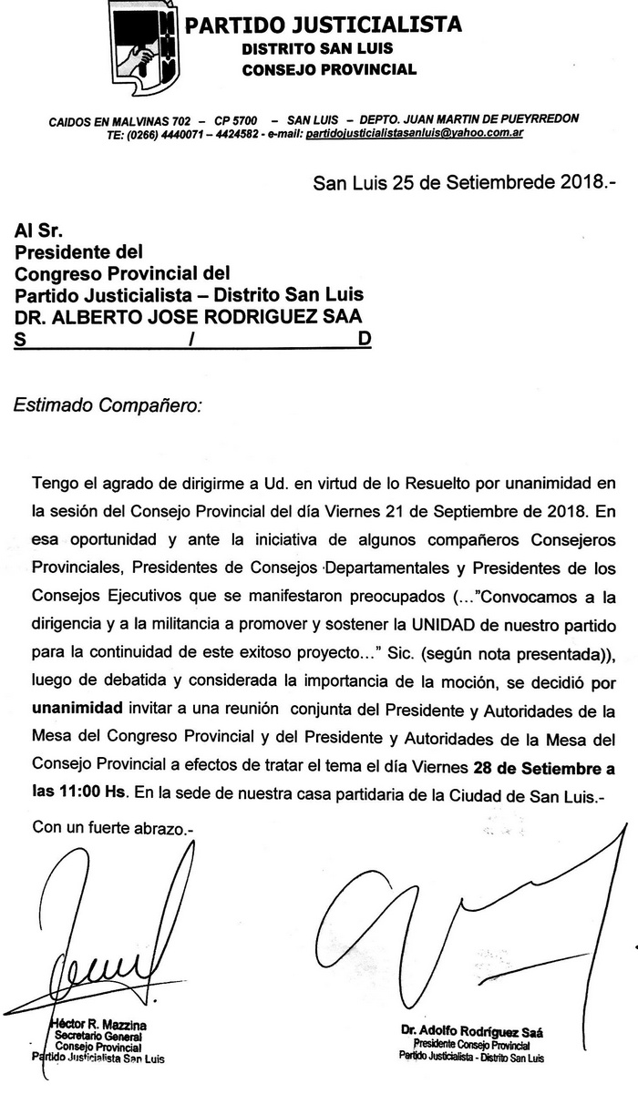 La invitación dirigida al Gobernador siguiendo lo resuelto en la reunión del pasado 21 de septiembre. “Convocamos a la dirigencia y a la militancia a promover y sostener la unidad de nuestro partido para la continuidad de este exitoso proyecto”.