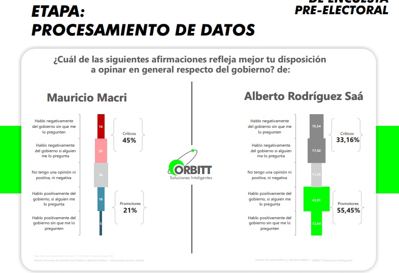 La encuesta mide además las opiniones de la gente con respecto a Mauricio Macri y Alberto Rodríguez Saá, y el nivel de satisfacción con sus gestiones. Como puede ver en la segunda imagen que acompaña esta nota, las opiniones positivas con respecto a Macri y su gestión alcanzan tan solo el 21%, mientras que las referidas a Rodríguez Saá llegan al 55,45%.