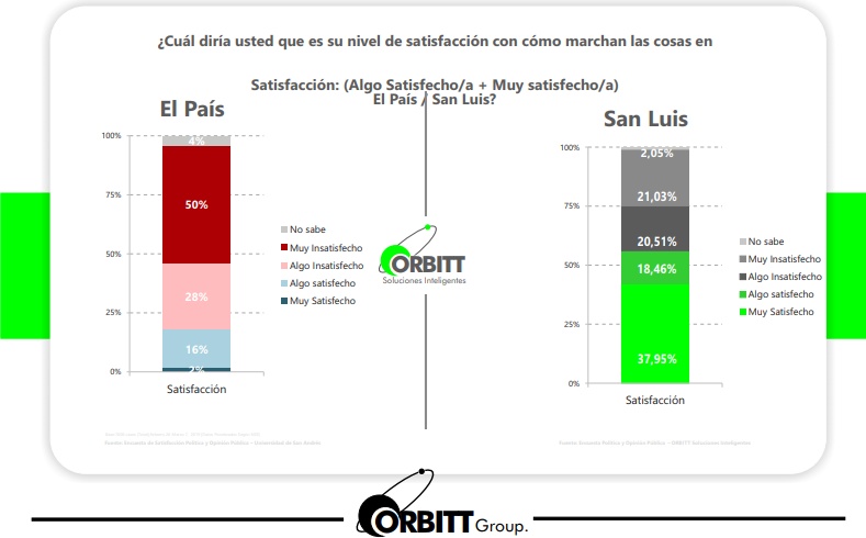 En cuanto a cómo marchan las cosas a nivel país, el 16% está “algo satisfecho” y el 2% “muy satisfecho”. Por el lado de San Luis, el 18,46% está “algo satisfecho” con como marchan las cosas, y el 37,95% “muy satisfecho”.