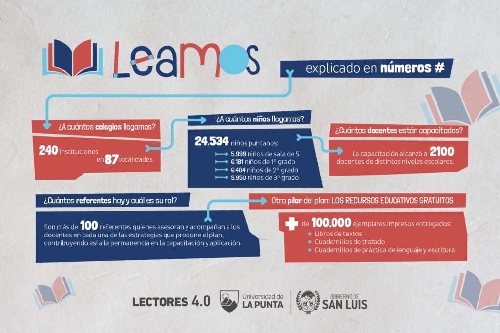 Lograr que actualmente 24.534 niños puntanos aprendieran con la metodología y mostrarán con sus avances que el Plan funciona, es el resultado de una estructura que incluye la capacitación de 2100 docentes por parte de la ULP (se forman en Neurociencias, Psicología Cognitiva del desarrollo, Sociolingüística Interaccional, y Lingüística) y el rol fundamental de 100 referentes del Leamos, que acompañan y supervisan al profesor en el proceso, capacitándolo semanalmente. Cada referente, a su vez, se capacita semanalmente con el equipo de capacitadores para validar las observaciones y así despejar dudas en el asesoramiento que llevan a cabo.
