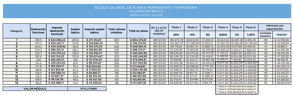 La última escala salarial publicada por el Senado de la Nación, con las categorías y sus sueldos.