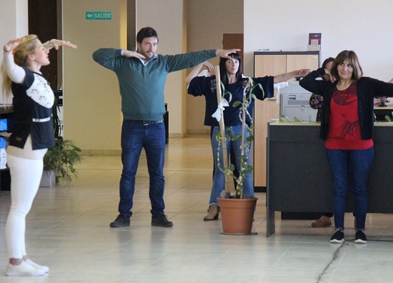 En esta primera etapa, la “pausa activa” está destinada a todo el personal que trabaja en las diferentes áreas del Ministerio de Salud en Terrazas del Portezuelo. Esto comenzó conjuntamente con las actividades por el Día Mundial del Corazón y se va a extender al resto de las reparticiones.