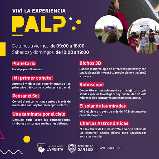 [dropcap style=”square”]L[/dropcap]uego de un exitoso verano, el Parque Astronómico de La Punta (PALP) renueva sus horarios y propuestas, para recibir al público que llegará en los meses fríos. Durante los próximos ocho meses, el PALP abrirá sus puertas de lunes a viernes, de 9 a 18, y sábados y domingos, de 10 a 19.