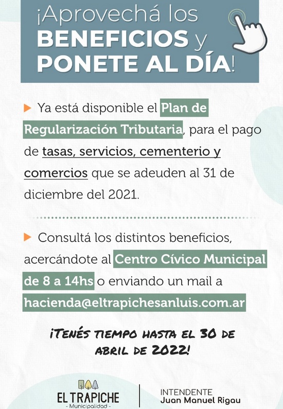 [dropcap style=”circle”]E[/dropcap]sta semana, la Municipalidad de El Trapiche largó un plan de regularización tributario de tasas, derechos y contribuciones adeudadas hasta el 31 de diciembre de 2021. Este plan comenzó el 1ro de febrero y finalizará el 30 de abril de 2022, luego de ser aprobado por el Concejo Deliberante del municipio.