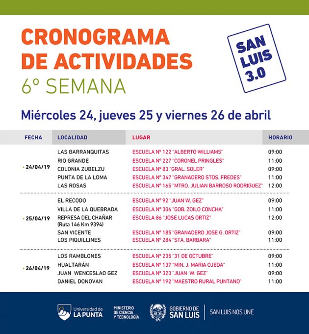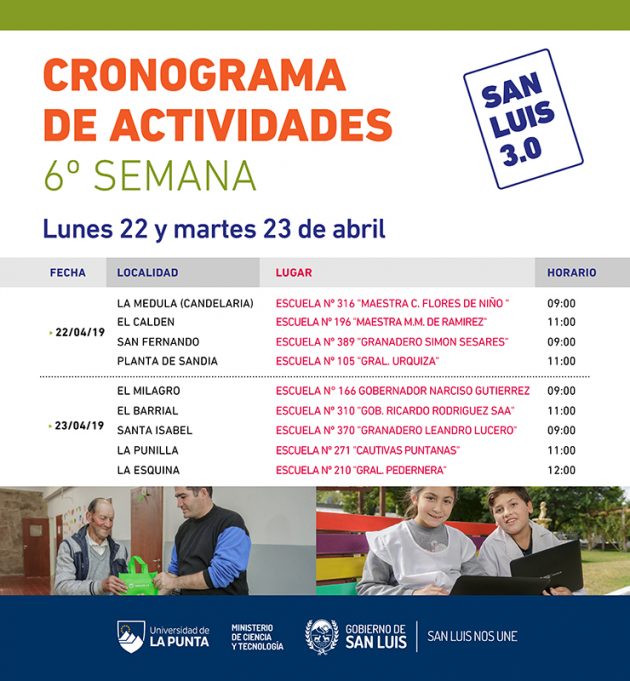 Hasta la fecha han sido visitadas las localidades de Nueva Galia, Candelaria, San Martín, El Volcán, El Trapiche, Luján, La Toma, Potrero de los Funes y Buena Esperanza. Allí recibieron sus dispositivos 547 alumnos de 1º grado, 601 alumnos de 4º grado y 835 jubilados. Estas visitas continuarán la próxima semana en Carpintería, San Francisco y Concarán.