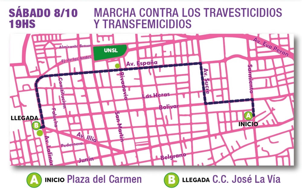 También se conoció el mapa del recorrido definitivo de las marchas de los días sábado y domingo, a través de la aplicación oficial del encuentro. Como puede apreciarse, la marcha del sábado, que será contra los travesticidios y transfemicidios, partirá de la plaza del Carmen, sobre avenida Sarmiento, y avanzará hasta Bolívar por la cual bajará hasta avenida Sucre (que en ese tramo en realidad se llama Presidente Perón). En Presidente Perón doblará a la derecha y seguirá hasta España, por donde realizará su descenso hasta Lafinur, para culminar en el centro cultural José La Vía.