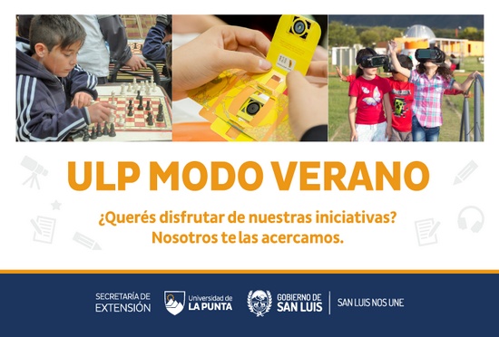 [dropcap style=”square”]B[/dropcap]ajo el lema “ULP Modo Verano”, la casa de altos estudios arranca la temporada estival llevando todas sus iniciativas, como realidad virtual, talleres de reciclado y robótica, a barrios y plazas. La apertura será este jueves 23, de 18:00 a 21:30, en plaza Pringles, para coincidir con el lanzamiento de las actividades del Programa Ajedrez. Así lo comentó el jefe del Programa Vinculación con la Sociedad, Facundo Rodríguez Iannello.