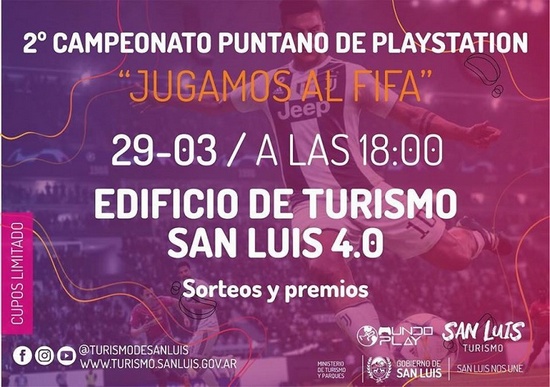 [dropcap style=”square”]E[/dropcap]ste viernes 29 de marzo, en la planta baja del Ministerio de Turismo (ubicado en avenida Illia esquina San Martín), se realizará el 2do Campeonato Puntano de PlayStation. En esta ocasión, el torneo será jugando al FIFA 19 y habrá premios y sorteos durante toda la jornada.