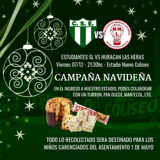 [dropcap style=”square”]S[/dropcap]portivo Estudiantes juega mañana desde las 21.30 horas en el Coliseo con Huracán de las Heras el último partido del año y aprovechó la ocasión para lanzar hoy la “Campaña Navideña” que tiene como objetivo un fin solidario.