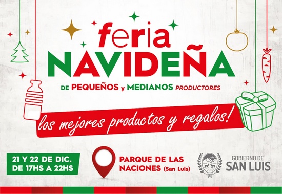 [dropcap style=”circle”]E[/dropcap]l Gobierno provincial prepara una Gran Feria Navideña de dos jornadas para disfrutar en familia. Será el próximo miércoles 21 y jueves 22 de diciembre, de 17:00 a 22:00, en el Parque de las Naciones. Habrá productores de Góndola San Luis, MADA, los chicos de “Tu Promo en la Feria”, shows en vivo, patio cervecero y muchas sorpresas más, esta vez, con espíritu navideño. La entrada es libre y gratuita.