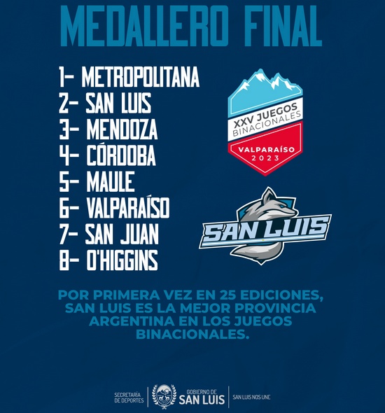 [dropcap style=”circle”]E[/dropcap]ste viernes finalizaron los 25° Juegos Binacionales en la región de Valparaíso y los deportistas de San Luis volvieron a ser noticia: ganaron 51 medallas y se subieron al 2° lugar del podio final. Es el mayor logro histórico de la provincia de San Luis en 25 ediciones de Binacionales. Primero quedó la región Metropolitana de Chile, lo que significa que San Luis fue la mejor de las 4 provincias argentinas que participaron.