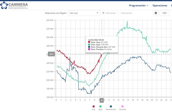 El pico de consumo de este lunes fue de casi 340 MW, superando ampliamente el promedio de la semana pasada, que fue de 207 MW.