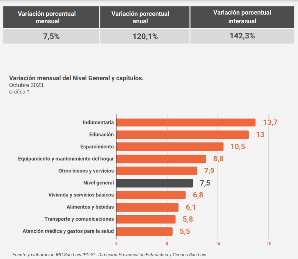 [dropcap style=”circle”]E[/dropcap]ste martes, la dirección provincial de Estadística y Censos en San Luis dio a conocer la inflación registrada durante el mes de octubre de 2023, la cual fue del 7,5%, mientras que la interanual trepó al 142,3%.