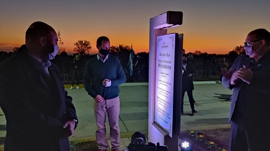 Tras las palabras de Olivero, se proyectó un video homenaje a Maradona, en el que dos artistas femeninas de La Punta realizaron un cover de “La Mano de Dios”, de Rodrigo Bueno, y se descubrieron dos placas conmemorativas de la obra. Del descubrimiento participaron “Chino” Maradona junto a Olivero y funcionarios del Gabinete municipal de La Punta. El acto culminó con el correspondiente corte de cinta y con Olivero, Poggi y Machuca Maradona dialogando, sacándose fotos y recorriendo la obra con los vecinos.
