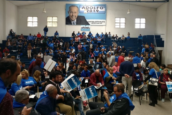 Por el momento, la sede está cubierta de “azul Adolfo” y desde hace minutos se reparten gratuitamente pancartas y remeras que lo proponen como candidato a gobernador.
