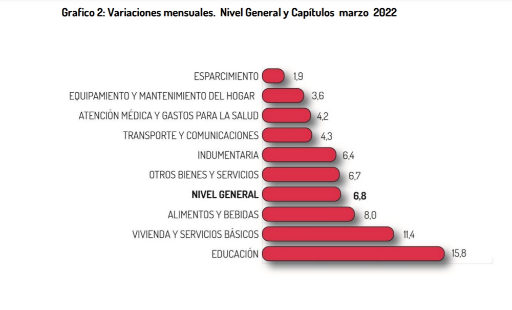 El rubro que mayor aumento registró el mes pasado, como suele ser habitual en marzo, fue “educación”, con un 15,8% debido al incremento en el valor tanto de matrículas como cuotas mensuales de los colegios de educación privada, institutos de idioma, artículos de librería, libros de texto.