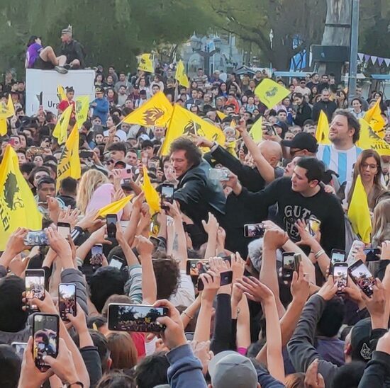 Desde allí, la caravana avanzó a paso de hombre, rodeada por cientos de seguidores, hasta la esquina de la Catedral, donde lo esperaba una verdadera multitud de miles de personas. Allí, la gente cantó cosas como “Milei presidente” y “la casta tiene miedo”, mientras el candidato saludaba, firmaba autógrafos en lo que sea que le gente le pasara, y agitaba cuadros y banderas que le alcanzaron. También se puso guantes de boxeo, gorras y otros objetos que la gente le pasó.