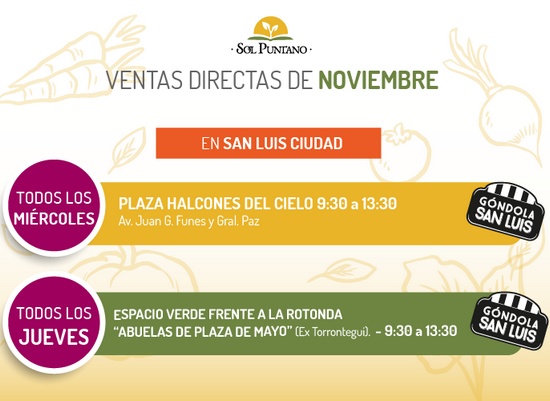 [dropcap style=”circle”]C[/dropcap]omo cada semana, los puntos de venta fijos de Sol Puntano acercan calidad y precio a los vecinos y vecinas de la ciudad. Los miércoles podés encontrarlos en la plaza “Halcones del Cielo”, en avenida Juan Gilberto Funes y General Paz, mientras que los jueves estarán en el espacio verde frente a la rotonda Abuelas de Plaza de Mayo (ex Torrontegui), de 9:30 a 13:30.