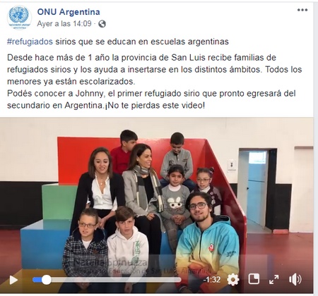 En la página de Facebook de ONU Argentina se hizo un post recientemente para difundir la política que impulsa el Gobierno respecto a los refugiados, específicamente, sobre los sirios que fueron recibidos en San Luis.