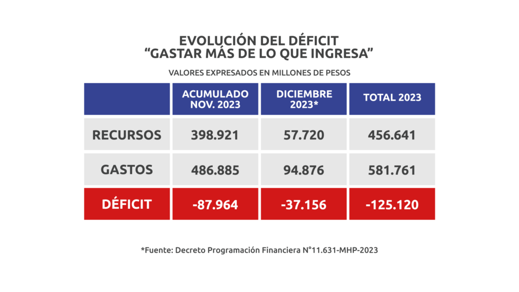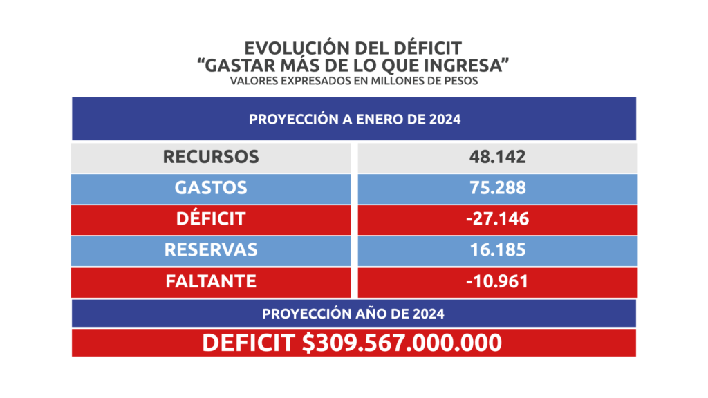 Para enero de 2024, Poggi proyectó un déficit de $27.000 millones, ya que la provincia tendrá ingresos por $48.142 millones y gastos por 75.288. Utilizando las reservas, el déficit será cercano a los $11.000 millones. “Hay un faltante de caja de 10.000 millones de pesos que nos impedirán abonar los salarios de enero, ni hablar a partir de febrero, donde no existe más reservas y renace el déficit de 27.000 millones de pesos”, dijo el Gobernador. A este ritmo, el déficit proyectado para 2024 será 309.567 millones de pesos, lo que equivale a “prácticamente la mitad del presupuesto de la provincia”.