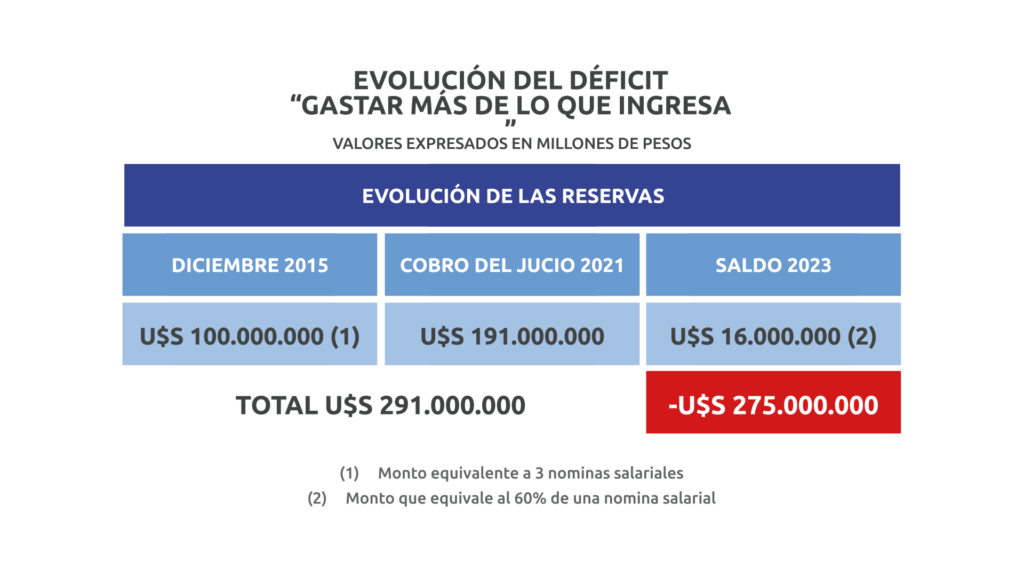 Durante su mensaje, mostró distintas placas, detallando en la primera de ellas el déficit de la provincia a diciembre de este año, el cual asciende a casi $125.120 millones. Acto seguido, se refirió a las reservas y aseguró que él, cuando finalizó su primer mandato allá por 2015, dejó 100 millones de dólares, a los que hay que sumarles los 191 millones del cobro del juicio a la Nación, llegando así a un total de 291 millones. De ese monto, solo quedan 16 millones de dólares, los cuales solo alcanzan para cubrir el 60% de una nómina salarial. “Se gastaron 275 millones de dólares”, remarcó Poggi.