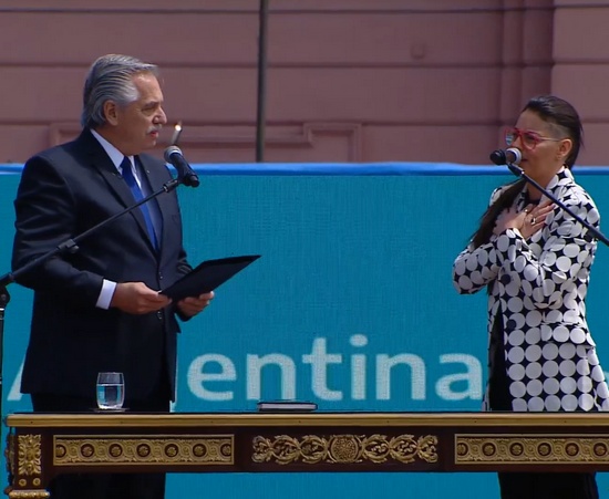 “Azo, azo, azo, se vino el Mazzinazo” y “se siente, se siente, San Luis está presente” cantaron los puntanos presentes cuando se leyó el decretó de designación de Mazzina y luego el presidente, Alberto Fernández, le tomó juramento. Junto a la puntana, asumieron Victoria Tolosa Paz como titular del Ministerio de Desarrollo Social; y Raquel “Kelly” Kismer de Olmos en el Ministerio de Trabajo. “Son 3 mujeres valiosas que deberán continuar la tarea de quienes las precedieron”, dijo el Presidente.