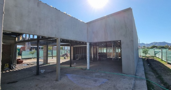 En cuanto al centro ubicado en Serranías Puntanas, mencionó que se está ejecutando las tareas de montaje de estructuras metálicas principales, columnas y vigas. Por otro lado, se están tomando los niveles para proceder con la colocación de las soleras de aluminio.