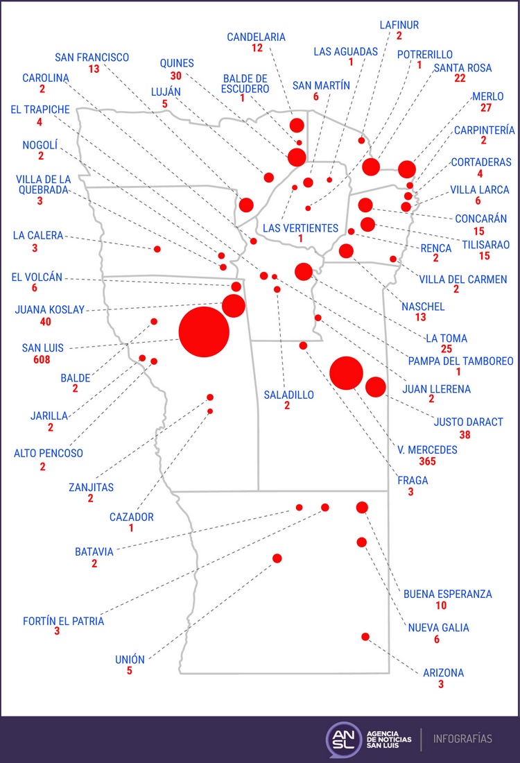 Las casas se construirán en 46 localidades. En la ciudad de San Luis se construirán la mayor cantidad de viviendas. Serán 608, luego viene Villa Mercedes con 365, seguido de Juana Koslay con 40, Justo Daract 38, Quines 30, Merlo 27 y Santa Rosa 22.
