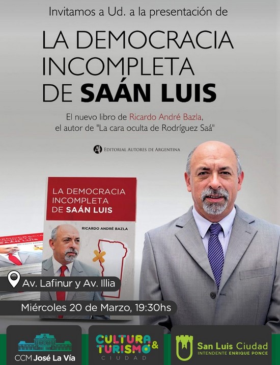 [dropcap style=”square”]H[/dropcap]oy a las 19.30, en el centro cultural José La Vía, el abogado y dirigente político Ricardo Bazla presentará su segundo libro, “La Democracia Incompleta de Saán Luis”. “Está escrito con un lenguaje muy directo, alejado de todo tecnicismo”, dijo Bazla, quien por años estuvo frente a la Asesoría Letrada de la primera gestión de Enrique Ponce como intendente.
