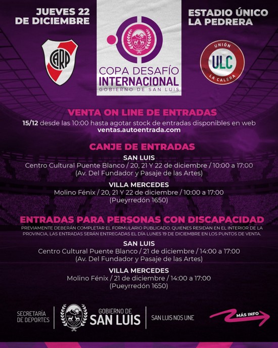 [dropcap style=”circle”]R[/dropcap]iver Plate jugará el 22 de diciembre en el estadio de La Pedrera desde las 21.15 con Unión La Calera de Chile y este jueves desde las 10 horas comenzará la venta online en la web de Auto Entrada. La venta presencial será a partir del lunes en 12 ciudades y localidades de la provincia.