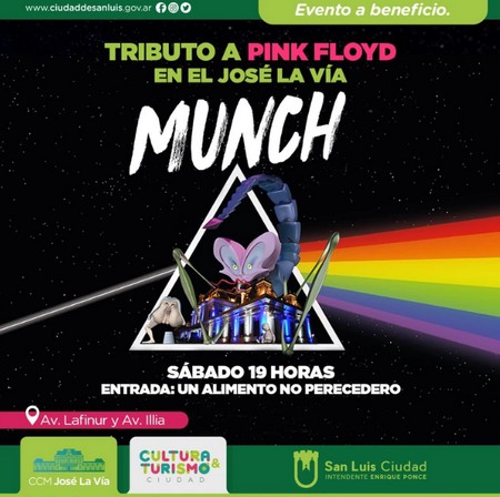 Este sábado, desde las 19 hs, la banda Munch rendirá un tributo a Pink Floyd, haciendo un recorrido por los míticos discos “The Wall” y “The Dark Side of the Moon” de Pink Floyd. La cita es en el centro cultural José La Vía y la entrada es un alimento no perecedero que será entregado a vecinos en situación de vulnerabilidad, según informaron desde la Municipalidad.