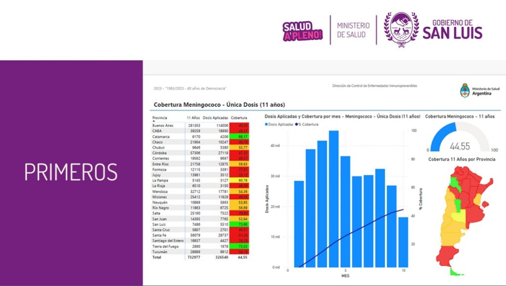 “Este informe de Nación, que tuvo como cierre el 30 de octubre, muestra a San Luis primera en varias vacunas de edad escolar (11 años) y segundo a nivel país sobre 24 jurisdicciones en cobertura de Triple Bacteriana (5 años – Ingreso Escolar). En lo que refiere a vacunas a los 12 meses de edad, se encuentra tercera mientras que Antigripal estamos a centésimas de ser los primeros”, detalló Rodrigo Verdugo, jefe del Programa Epidemiología, quién agregó: “Estos indicadores muestran el gran trabajo en inmunización que se realiza en la provincia, observando distintas vacunas en distintos grupos etarios, que demuestran el alcance de las vacunas en la población”.