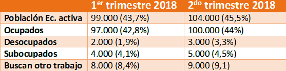 El informe del ente nacional sobre el mercado de trabajo del segundo trimestre del año revela que de 104.000 personas económicamente activas (población ocupada más la población desocupada), 100.000 (44%) tienen trabajo, 3.000 (3,3%) no tienen empleo, 9.000 (9,1%) tiene trabajo, pero buscan otro y 5.000 (4,5%) están subocupadas.
