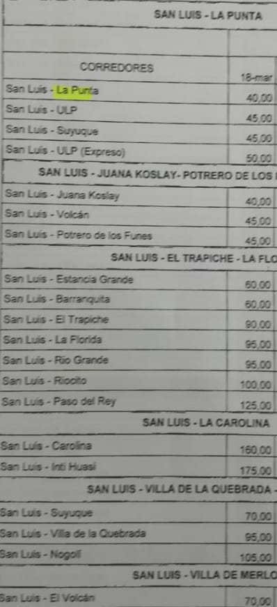 [dropcap style=”square”]A[/dropcap] última hora del día de hoy finalmente se dio a conocer el nuevo aumento de la tarifa del transporte interurbano, el cual comenzará a regir este lunes 18 de marzo. Este nuevo aumento es del 33% en algunos corredores, como de la Capital a Juana Koslay y a La Punta, donde el boleto pasará de $30 a $40. En el caso de Potrero de los Funes, el aumento es un poco menor, del 28,5%, por lo que el boleto se irá de los $35 actuales a $45.