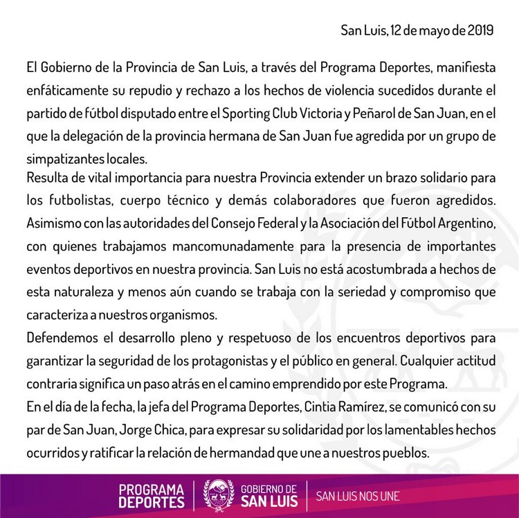“La Asociación del Fútbol Argentino y el Consejo Federal se dirigen a la opinión pública a fin de manifestar su absoluto repudio por los hechos de violencia acontencidos en el partido disputado ayer en la Provincia de San Luis entre los clubes Sporting Club de Victoria de dicha provincia y Peñarol de San Juan por el Torneo Federal Amateur.