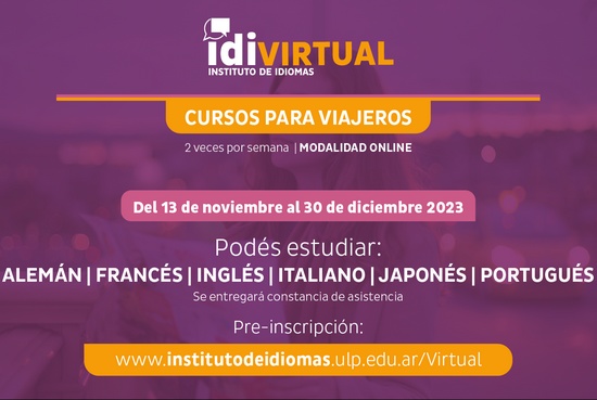 [dropcap style=”circle”]E[/dropcap]l Instituto de Idiomas (IDI) de la Universidad de La Punta (ULP) vuelve a lanzar otra edición de sus cursos de idiomas para viajeros, destinados a aquellos puntanos que están por viajar a un destino extranjero sin hablar su lengua. La formación, que es online, inicia el 13 de noviembre y finaliza el 30 de diciembre. La inscripción se realiza en www.institutodeidiomas.ulp.edu.ar